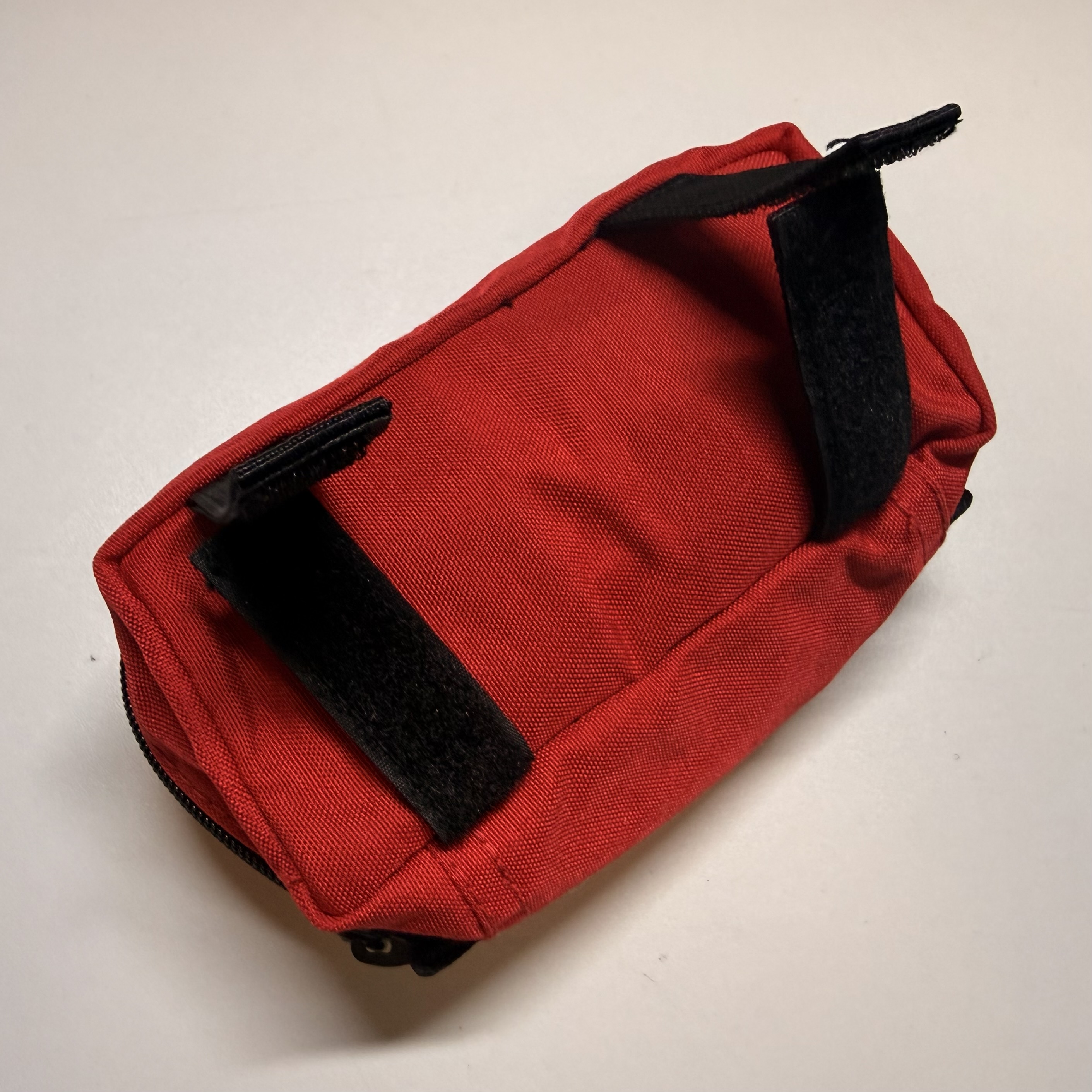 Mini apteczka osobista AOMini wykonana z CORDURY. Kolor czerwony. Można ją założyć do paska spodni. W środku 2 gumy do mocowania akcesoriów i rozwijana siatkowa kieszeń na zamek. Haftowana gwiazda życia. Dodaliśmy elementy odblaskowe i zastosowaliśmy profesjonalne taśmy.